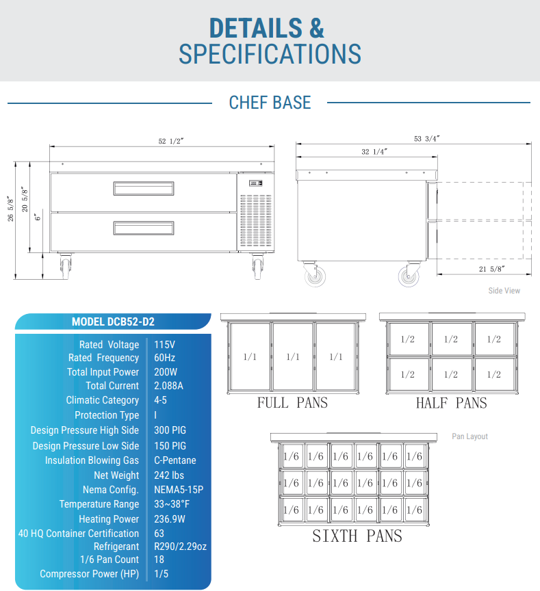 The Dukers DCB52-D2 Chef Base Refrigerator with 2 Drawers is a purpose-built refrigeration solution tailored exclusively for commercial kitchen environments. Featuring two drawers and measuring 52 1/2" x 32 1/4" x 26 5/8" in dimensions, it offers ample storage space while seamlessly integrating into kitchen layouts. With a temperature range of 33~38°F and automatic defrost, it ensures precise temperature control for optimal food preservation. Constructed with stainless steel interior and exterior, along with rounded corners for easy cleaning and sanitation compliance, it prioritizes durability and hygiene. Equipped with digital temperature control and foamed-in-place insulation for added structural strength, it offers both functionality and reliability. The heavy-duty 4" casters with brakes provide convenient mobility for cleaning and servicing. Featuring ergonomic recess door handles and removable drawer gaskets, it enhances ease of use and maintenance. Supported by a warranty for commercial use, this chef base refrigerator is a dependable choice for commercial kitchens seeking performance and longevity.