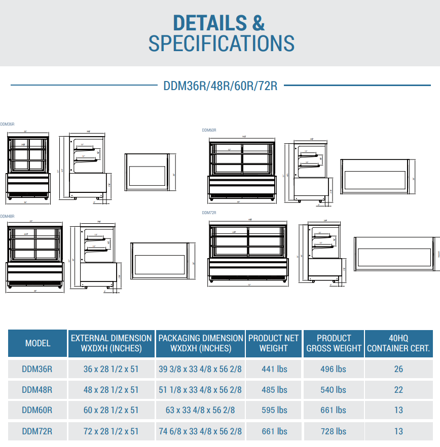The Dukers DDM48R is a sophisticated refrigerated cake showcase designed to exhibit your delicacies with style while preserving their freshness. Featuring two shelves providing three levels of display space, it offers generous room for your assortment. Its temperature range of 33°F to 41°F ensures ideal storage conditions, supported by automatic defrost and the eco-friendly R290 refrigerant. Constructed with a stainless steel interior and exterior in an elegant black finish, and adorned with straight and side glasses, this showcase enhances visibility while maintaining a sleek appearance. Equipped with LED lighting both inside and on the canopy, a digital temperature display, and a NEMA 5-20P plug for easy setup, it combines functionality with aesthetic appeal, elevating your dessert presentation to new heights.