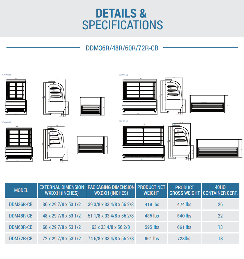 The Dukers DDM60R-CB is a sophisticated refrigerated cake showcase designed to showcase your delectable creations while maintaining their freshness. With three shelves providing four levels of display space, it offers ample room for showcasing a diverse assortment of cakes. Its temperature range of 33°F to 41°F ensures optimal storage conditions, supported by automatic defrost and the use of eco-friendly R290 refrigerant. Crafted with a stainless steel interior and exterior finished in sleek black, and adorned with a combination of straight and side glasses, this showcase not only enhances visibility but also adds a touch of modernity to any space. Equipped with LED lighting both inside and on the canopy, a digital temperature display for easy monitoring, and a NEMA 5-20P plug for straightforward installation, it seamlessly combines functionality with aesthetics, making it an ideal choice for elevating your dessert presentation.